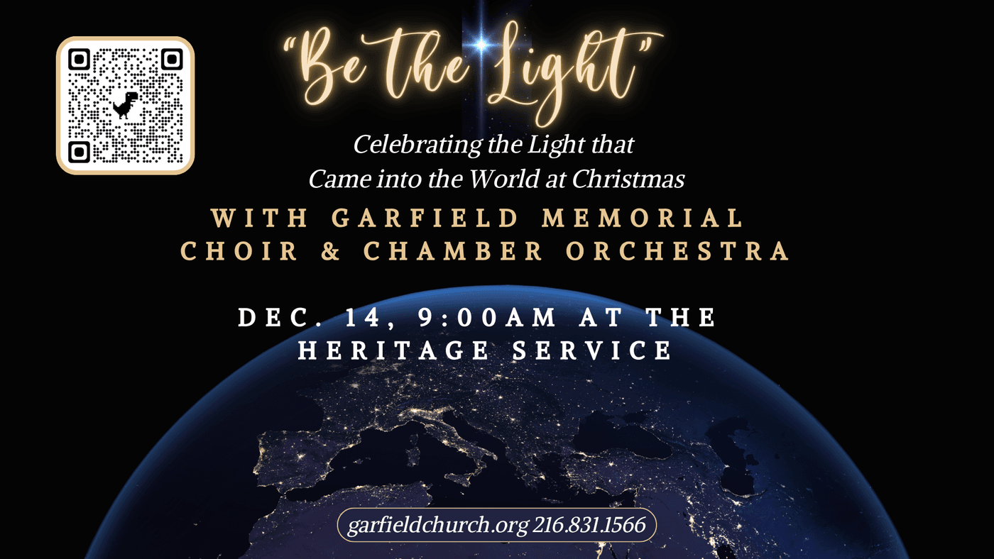 "Be the Light" – Sunday, Dec 14th at 9:00 am in the Heritage Service. The Garfield Memorial Church Choir and Chamber Orchestra are pleased to celebrate in music the Light of God's love for all people. Come and worship Christ the newborn King!